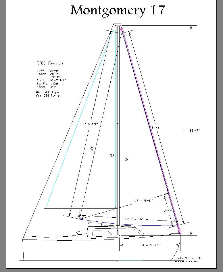 As far as the sail goes, I solicited 8 or 10 bids with the North Sail price about in the middle of the group at $820.00. The highest was Neil Pryde at $1200.00 and the lowest was Mac Sails around $450.00. I went with North because of recommendations, reputation and some speculation. I specified ----150% All Purpose Genoa - 4.75 oz. NorDac sail cloth, UV leech and foot, Rope Reefing Pad, furling patch, and webbing attachments at the head and tack instead of grommets as recommended by CDI as well as # 6 luff tape. My preference was to have the sail furled counterclockwise and un-furled clockwise to starboard. They need to know this so the UV material is attached to the correct side. The UV material is a lightweight product as opposed to the heavier Sunbrella. I think Sunbrella UV protection would be too heavy for a sail this size. I went with their recommendation and chose the rope-reefing pad. I was told the foam leach tends to establish a set or memory in the shape of a curve after time. I don't know if this is true but I do know the rope luff works extremely well.